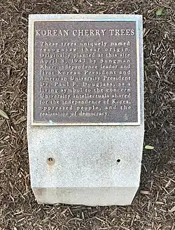 - In 2017, Eun Ju Cheong et al. were able to distinguish two distinct groups, king cherry and Yoshino cherry, using sequence polymorphisms in eight chloroplast DNA (cpDNA) noncoding regions. This study also revealed that the three "Korean cherry trees" which had been planted on the campus of the American University by the former South Korean president Syngman Rhee in 1943 and have been believed to be king cherry[35] were Yoshino cherry not king cherry.[36]