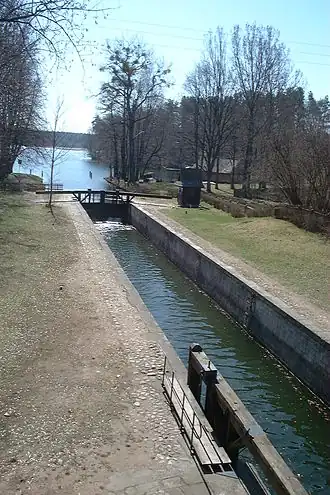Przewięź Lock - the sixth lock on the Augustów Canal (from the Biebrza River). Located in the village Przewięź, Poland between the lakes Lake Studzieniczne and Lake Białe Augustowskie was built in the 1826–1827 by Lt.-Col. Eng. August Szulc. To this day, preserved in their original condition.