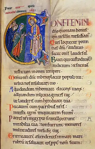 ![]() Illuminated manuscript of Psalm 106:1-8 in the St. Albans Psalter, beginning with initial C for Confitemini | |