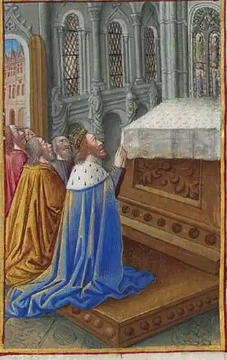 ![]() Miniature psaume 123, The Redeemer of Israel in the Très Riches Heures du Duc de Berry, David praying before an altar surrounded by four figures symbolising people in danger | |