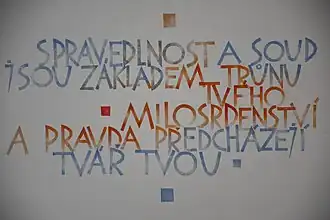 ![]() Czech inscription of Psalm 89:14 at the Evangelical Church of Czech Brethren in Brno-Husovice. "Justice and judgment are the habitation of thy throne: mercy and truth shall go before thy face." (KJV) | |