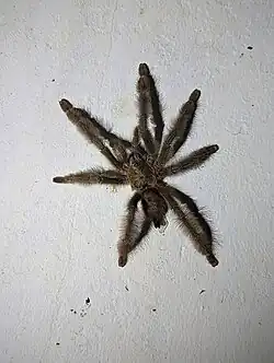 Psalmopoeus pulcher is a species of tarantula with long hairs that is predominantly gray with a slight hint of a pale yellow or beigey color.[2]