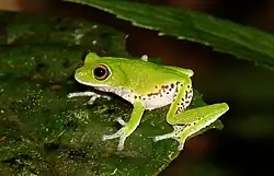 The adult male frog measures 29.4 โ 31.3 mm in snout-vent length and the adult female 33.8 โ 35.0 mm. The frog's head is a bright, luminous green color. The flanks are yellow and white in color. Parts of the mouth are white in color. The tops of the hind legs are green in color, and parts of the tops of the back legs are white in color. The toes of all four feet are white in color. This frog has disks on its toes for climbing. They are white in color.[3]