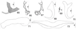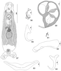 Pseudorhabdosynochus firmicoleatus is a small monogenean, 400-500 μm in length.[1] The species has the general characteristics of other species of Pseudorhabdosynochus, with a flat body and a posterior haptor, which is the organ by which the monogenean attaches itself to the gill of is host. The haptor bears two squamodiscs, one ventral and one dorsal. The sclerotized male copulatory organ, or "quadriloculate organ", has the shape of a bean with four internal chambers, as in other species of Pseudorhabdosynochus.[2] The vagina includes a sclerotized part, which is a complex structure.