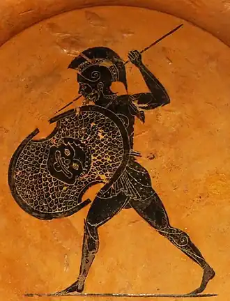 ![]() Dionysos holding out a kantharos, black-figured plate by Psiax, ca. 520-500 BC, British Museum (B 589). | |