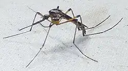 This mosquito is very large, has shaggy legs, and has a wing length of 6.0โ6.5 mm (0.24โ0.26 in).[2] The scales on the wings are narrow and dark brown. The proboscis is long and brown. The palpi are nearly half as long as the proboscis and brown. The proboscis and the palpi are covered with setae. The head has broad, flat, grayish-white scales except for a narrow median bare stripe. The thorax is dark brown to black. The abdomen has a broad median patch of white scales. The legs are dark yellow and purple.[3] The adult females are persistent biters and will attack at any time of the day.[4] It can spread the West Nile virus,[5] and can puncture clothing such as through a coat, vest, and two shirts since the species is 8 to 10 mm long.[6]