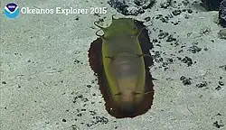 All psychropotidae can swim short distances, yet certain species, such as Psychropotes longicauda spend much of their juvenile phase in the pelagic zone.[5] "Mortensen, 1927, speculated that 'The long tail probably is a swimming apparatus"; his suggestion is apparently true for juveniles of this species, but not for adults".[6] Several authors describe the ability of a number of Psychropotes species to use a large, unpaired dorsal appendage as a 'sail' to move with the prevailing current, contorting their body so as to steer their movement. The great variation of this appendage throughout the Holothuroid family suggests that this adaptation is significant in allowing species to access food sources in the food-scarce environments in which they live.[7] "Ostergren (1938) noted that most species in the Family Psychropotidae and some synallactids such as genus Paelopatides are darker in color ventrally than dorsally. He suggested that the differing colors may conceal swimming animals from predators above and below.[6]"
