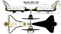 2K (GRAU index serial number 11F35 2K, NPO Molniya airframe number 1.02), often referred to as Ptichka (Russian: Птичка, "little bird", although this was also a nickname for all orbiters in the programme[2]), is the second Buran-class orbiter, produced as part of the Soviet/Russian Buran programme. Although 2K was the closest to being completed of any of the Buran-class orbiters (after the orbiter Buran), it was never finished. The program was officially cancelled in 1993, at which point the shuttle was 95-97% complete. The proposed official name for 2K was Burya (Russian: Буря, "storm" or "tempest").[1][3]
