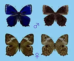 Males sport an iridescent blue-purple upperside wings with sometimes white or blueish subapical or antemarginal markings. This blue color is the result of the presence of scutes featured by the wing scales, which are layered and reflect blue light.[4] The underside of the wings are brown in color, with marbled patterning of a darker brown, in addition to wavy transverse lines in the discal area. Some species sport silvery lines on their wing undersides. The underside sport a series of submarginal ocelli between the wing cells R5 to 1A + 2A. The ocelli patterning feature "imaginary outermost rings", scales which border the ocelli proper.[5] The R5 cell often larger and inwardly displaced. The curbital branches of the forewing are displaced by modified scales which are covered by a Hair-pencil between veins CuA1 and M3, with the exception of Ptychandra schadenbergi, and a hair pencil pouched between veins CuA1 and CuA2 one third of the length of the wing and found in the interneural furrow, with the exception of P. talboti. The eyes of the butterfly are hairy, as are the palpi on the second segment. Antennae are half the length of the costa. The butterfly exhibits tibial spurs. The forewing cell of the male is one third of the length of the costa. Vein M3 is colinear with the lower discocellular vein. The median discocellular vein is almost straight between the origins for veins M2 and M3, slightly angled towards the origin of vein M2. This makes it meet with the lower discocellular vein, at an approximate right angle with it. The origins of both the subcostal and cubital veins are both slightly swollen at the base, and the anal vein is slightly less swollen. The hindwing cell is closed and is around half the length of the wing. The vein Sc + R1 is slightly inflated towards the humeral vein. The M3 vein extends past the margin of the wing to form a tail, with lobes at the edges of veins CuA1 and CuA2 for some species. The origins for veins CuA1 and M2 are separated from each other.[1]