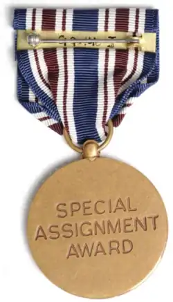 The PHS Special Assignment Award is awarded to officers who are detailed via official personnel orders for a minimum of 30 days, either consecutive or non-consecutive, to a special program initiative of a United States Government agency, a government agency of a U.S. state, or other organizations. The Surgeon General of the United States validates special initiatives and activities, as well as required timeframes for participation, that qualify an officer for the award.[2][3]