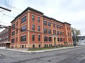 Public School No. 60, also known as Riverside Academy, is a historic school building located in the Riverside neighborhood of Buffalo, Erie County, New York. The original section was built in 1897, and is a three-story, 12 bay, "I"-plan red brick building with Renaissance Revival detailing. It sits on a raised basement and features polychrome, stepped façade, quoining, and classical entrances. A substantial three-story rear addition was built in 1922 and includes an auditorium.[2] The building has been converted to accommodate 68 units of affordable housing.