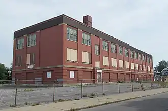 Public School No. 63, also known as Campus North School, is a historic school building located in the Kensington-Bailey neighborhood of Buffalo, Erie County, New York. The original section was built in 1917, and is two stories above a ground floor, giving the appearance of a three-story red brick building with Classical Revival detailing. The original H-shaped plan consisted of classrooms located in the wings, with gymnasium, swimming pool and auditorium located centrally. Northeast and northwest corner additions were built in 1925. The building is an example of a typical standardized public school plan developed by city architect Howard L. Beck.[2] The school has been redeveloped as an apartment building known as The Lofts at University Heights.