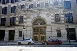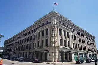 The Public Service Building is a four-story neoclassical Beaux-Arts office building occupying a whole city block in Downtown Milwaukee. Featuring a two-story marble lobby, stained-glass skylights, and an auditorium, it was originally designed as a mixed-use facility serving both interurban passengers and office workers of The Milwaukee Electric Railway and Light Company (TMER&L). An arch surrounding the entrance depicts technological progress in transportation: first as a horse-drawn streetcar, then as an electric streetcar. In the lobby, a copper art piece shows bees buzzing around a beehive, representing the amount of activity occurring inside. Rail vehicles formerly entered and exited the building through multiple ground-level access points.[1] A skyway connects the Public Service Building with a second building that, together, form the downtown headquarters for We Energies.[2]