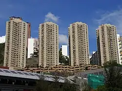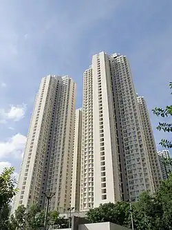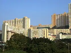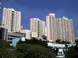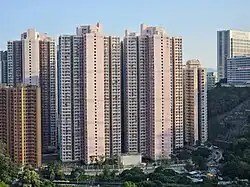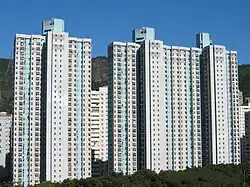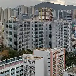 Kwai Hing Estate (Chinese: 葵興邨) was built in the valley of Gin Drinkers Bay,[24] later the town centre of Kwai Chung. Kwai Hing station is named after the name of the estate. It comprises 4 buildings with a total of 400 rental units (TPS units excluded) and 1 shopping arcade. Before redevelopment, it consisted of 5 buildings which were completed between 1970 and 1972. In 1985, the HKHA announced that the strength of the concrete in blocks 3, 4 and 5 of Kwai Hing Estate were below standard.[25] All the blocks were later demolished between 1988 and 1992 to cope with the estate redevelopment.[22] The estate was later redeveloped with 5 buildings between 1991 and 1992.