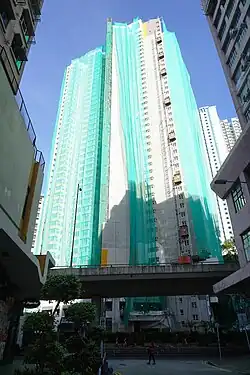 Kwai Fong Estate (Chinese: 葵芳邨) is built on the reclaimed land of Gin Drinkers Bay, later the town centre of Kwai Chung, and the south of Kwai Hing Estate. Kwai Fong station is named from the name of the estate. It comprises 12 buildings with a total of 6400 units and 1 shopping arcade. Before redevelopment, it consisted of 11 buildings which were completed between 1971 and 1973. In 1982, the buildings were revealed to have structural defects.[21] In 1985, the HKHA announced that the strength of the concrete in blocks 8, 9, 10 and 11 of Kwai Fong Estate was below standard. Those blocks were demolished between 1985 and 1989.[22] Other old buildings were also demolished in the 1990s to cope with the estate redevelopment. The estate was later redeveloped with 12 new buildings built between 1987 and 2002.