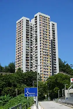 Sheung Man Court (Chinese: 尚文苑) is a Home Ownership Scheme court in Texaco Road, Kwai Chung, near Tai Wo Hau Estate and MTR Tai Wo Hau station. It comprises one block with 494 flats in total. Saleable flat area ranges from 26.6 to 42.6 square metres sold from HK$1.77M to HK$3.54M,[61] after applying a 41% discount from the assessed market values.[62] It was sold in 2019 and is expected to complete in 2020.[61]