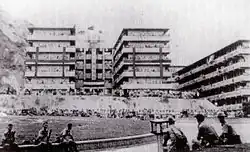 The Shek Kip Mei Estate, ready for occupation in 1954, was the first tangible manifestation of this policy.[7] These resettlement blocks were built in the basic design of H-shape.[10] In those early days, housing units were little more than small cubicles, and the original plan was to allocate 24 square feet (2.2 m2) per adult and half that for each child under 12.[11] However, they were in reality often occupied by more than one family, due to the extreme shortage of available housing.[12] Facilities and sanitation were rudimentary and communal, like the bath rooms and laundry areas, were located in the cross bar of the "H", linked the residential wings on two sides.[10] Rents were pitched at between HK$10 and 14, without caps on income. That year, the Resettlement Department was formed, as was the first Housing Authority (sometimes referred to as "former Housing Authority"), out of the Urban Council, through enactment of the 1954 Housing Ordinance.[13] The demolition of the buildings of Shek Kip Mei Estate was started from 2007, and has now been extensively redeveloped.[10] Today, all H-shaped resettlement blocks have had to be demolished, with only the Mei Ho House still standing.[14]