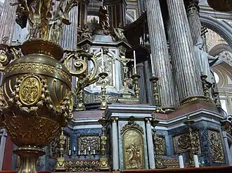 Among the sacred vessels, two gold ones stand out, as well as a monstrance, made by José Inzunza. An elegant tenebrio of 5 and a half meters high in ebony wood richly adorned with silver, the work of José Mariano Castillo.[14]