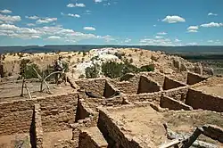 Spaces were generally divided into four sections aligned with the cardinal directions, which held religious significance. The great houses at Pueblo Alto were aligned along a north–south axis.[4] Entrances to structures were generally south or southeast facing.[2][4] This provided shade from summer sun and warmth from winter sun.[2] The back of the buildings were joined together with a large wall to provide shelter from wind.[4] At the center of the structure was a plaza, meant to serve as a community center.[4] Great house complexes are also characterized by earthen berms and formal road segments.
