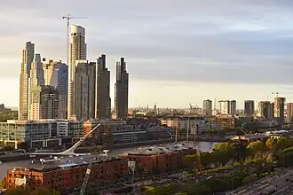 Puerto Madero, also known within the urban planning community as the Puerto Madero Waterfront, is a barrio of Buenos Aires in the Central Business District. Occupying a significant portion of the Río de la Plata riverbank, it is the site of several high-rise buildings and luxurious hotels, featuring the latest architectural trends.[1][2] Puerto Madero has by far the highest property values of any barrio within Buenos Aires, surpassing the second-highest twofold.[3]