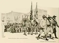 On April 6, 1917, the United States Congress declared war on Germany. By May 3, the Regiment was transferred to the regular Army and recruited 1,969 men and the 295th, 296, 373rd, 374th and 375th regiments of Puerto Rico were created. The United States continued to apply their military segregation policies to the native Puerto Ricans. Puerto Ricans of African descent were assigned to all black units such as the 375th Regiment.[4] Puerto Ricans were to be sent to North Carolina to train for deployment overseas, however Senators from the southeastern states opposed and foiled these plans, citing that Puerto Ricans would be a problem to the laws and customs of the racist Jim Crow policies. Southern politicians were alarmed of the idea of having armed African-Americans in the south and believed that Puerto Ricans of mixed race, who did not understand their racial policies, would only add to their problems.[19] On May 17, the Porto Rico Regiment of Infantry was sent to guard the Panama Canal in defense of the Panama Canal Zone and other vital military installations while the other Puerto Rican regiments guarded Puerto Rico.