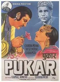 Pukar is a 1939 Indian film produced and directed by Sohrab Modi at the Bombay-based production house Minerva Movietone. The film is about Mughal emperor Jehangir's legendary justice and his inner conflict when his wife kills an innocent citizen by mistake.
