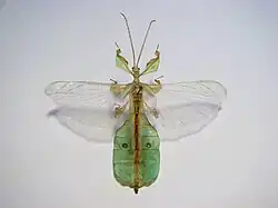 The insect has green, broad body and legs and frequently has spots. Both females and males occur in shades of green, yellow, and orange.[4] Java leaf insects would be greenish or brownish as adults. Males range from 2.6 to 3.7 inches (66 to 94 mm). The organism's forewings and camouflage are used for defense. The antennae of the females are very short, while those of the male are longer. Adult females are 1.8–2.7 inches (46–69 mm) in length. The species also has hind wings which are used for flying by males, but are unused by females. Young Pulchriphyllium bioculatum are about 2 cm (0.79 in) long, dark red in colour and have reflex immobility. The species molts 5–6 times in a lifetime.[5] Females are heavy-bodied and flightless, and each lays about 500 eggs in a lifetime.[6] The abdomen is narrower at the base, and the femur of the fore legs are dilated.[7]