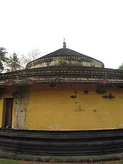 The temple is built in Kerala style architecture, common in all temples in the South Indian state of Kerala in Eastern axis. The temple has no gateway tower and has an arch from the main road. A rectangular wall around the temple, called Kshetra-Madilluka pierced by the gateways, encloses all the shrines of the temple. The metal plated flagpost or dvajasthambam is located axial to the temple tower leading to the central sanctum. Chuttuambalam is the outer pavilion within the temple walls. The central shrine and the associated hall is located in a rectangular structure called Nallambalam, which has pillared halls and corridors.[7] Between the entrance of Nallambalam to the sanctum, there is a raised square platform called Namaskara Mandapa which has a pyramidal roof. Thevrapura, the kitchen used to cook offering to the deity is located on the left of Namaskara Mandapa from the entrance. Balithara is an altar is used for making ritualistic offering to demi-gods and the festive deities. The central shrine called Sreekovil houses the image of the presiding deity. It is on an elevated platform with a single door reached through five steps. As per Kerala rituals, only the main priest called Thantri and the second priest called Melshanthi alone can enter the Sree Kovil.[8] The central shrine has a circular plan with the base built of granite, superstructure built of laterite and conical roof made of terrocata tile supported from inside by a wooden structure.[9] The temple has shrines of Dakshinamurthy, Krishna, Bhagavati, and Ayyappa.[5]