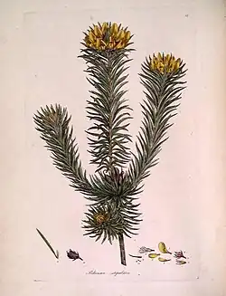 The genus Pultenaea was first formally described by botanist James Edward Smith in 1794 in A Specimen of the Botany of New Holland.[6] The first species he described was P. stipularis from a living specimen raised in Stockwell, England from seed obtained from New South Wales in 1792.[7] Smith named the genus in honour of Richard Pulteney, an English surgeon and botanist, who also was the biographer of Linnaeus.[8]