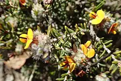Pultenaea barbata is a species of flowering plant in the family Fabaceae and is endemic to the south of Western Australia. It is a prostrate or spreading, spindly shrub with hairy, needle-shaped leaves and yellow, red, orange or brown flowers with red or yellow markings.