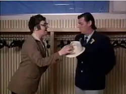 ![]() Herra 47 ("Mr 47" on the left, played by Pirkka-Pekka Petelius) trying to get into a restaurant. Aake Kalliala on the right. | |