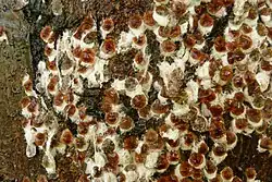 The adult scale insect resembles a limpet and remains stationary on the bark of its host tree where it feeds on sap. Although males can occur, the insects are normally all female, and reproduce by parthenogenesis.[4] In early summer, the mature female lays white, circular egg masses which become visible as they protrude slightly from under her brown scale. The eggs hatch into nymphs which crawl away from the mother along the branches to find foliage, where they start to suck sap. In the autumn, they return to the trunk and larger branches where they spend the winter as flat scales about 1 mm (0.04 in) long. They resume feeding in spring and are fully grown by early summer. There is a single generation each year and the adults die after reproducing.[2] This insect has glands that produce several forms of wax; some glands produce water-repellent wax that keeps the air passages leading to the spiracles open. Other glands produce long white filaments of wax that serve a function in the construction of the sac that surrounds the eggs. To avoid getting contaminated by its own honeydew, the scale insect has a six-bristled mechanism close to the anus, with which it can flick away its excrement.[5]