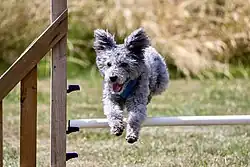 The Pumi (in Hungarian, the plural form is pumik) is a medium-small breed of sheep dog from Hungary. They are capable herding dogs, able to gather and work close to farm stock, particularly sheep, to keep them under control. Pumik have an extended, tapered muzzle with prominent ears, and a tail curled over their back, and are sometimes described as having a whimsical expression. The double coat (black, white, grey, or fawn) has a mix of wavy and curly hair.