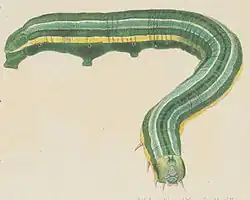 The larvae feed on Norway spruce (Picea abies) and silver fir (Abies alba). The species overwinters in the larval stage.