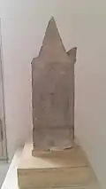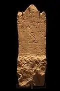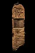 Most of the inscriptions include a general dedication (the ʾŠ NDR part), but a minority of them include a certain specific vowed object(s): obelisks and masks,[4] copper altar,[5] wooden cart/carts/female calf,[6] et cetera. Some of the inscriptions describe the stele of the vowed object as a gift, mostly in the version ʾŠ YTN ("which gave", as opposed to ʾŠ NDR) or with MTNT ("gift"),[7][8][9][10][11][12][13] and some mix both the gift and the vow versions.[14] Some inscriptions are made in an extremely short formula, including only the vower's name and the word NDR (as a noun – "the vow of")[15] or MTNT ("the gift of").[16] The closing statement rarely appears as "for he/she/they heard the voice of his words".[17] There are also some exceptions in the order of the parts of the standard formula.[18] A few inscriptions warn a potential thief that Tinnit or Baal Hammon, to whom the stelae were dedicated, will punish him.[19]