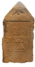 The stelae themselves were mostly artistic and stylized, and various decorations and religious symbols are engraved on them, often related to the content of the inscriptions. The most common symbols are Sign of Tinnit, a crescent with a disc, a hand or two spread up, and Caduceus.[38] The first sign, called "Sign of Tinnit", symbolizes according to most researchers the goddess Tinnit; her common epithet, PN BʿL appears as ΦΑΝΗΒΑΛΟΣ on a coin from Ashkelon near the symbol of Tinnit.[39] The second symbol, a crescent with a disc, is the symbol of Baʿal Ḥammon; it appears on stelae dedicated to both Tinnit and Baal Hammon or only to Baal Hammon, but does not appear on stelae dedicated only to Tinnit.[40] Moreover, the symbol appears on stelae from Samʼal, on which Baal Hammon is mentioned (like Kilamuwa stele).[41] The Caduceus might symbolize both gods in some sort of a joint cult, but it exact meaning remains unknown.[42]