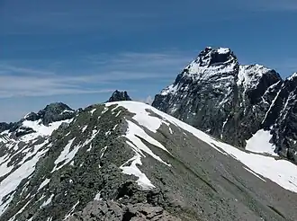 From the summit, a secondary ridge extends west-southwest to a col and ascends to a secondary peak at 3,054 m, located about 500 m from the main summit. From the 3,054 m elevation, the ridge bifurcates. One branch, known as Costa Ciabert, descends initially west-northwest, then turns west, taking the name Costa Sela, and descends toward the valley floor just above the hamlet of Chianale. The other branch descends southwest, taking the names first Costa Tre Chiosis, then Costa Ciarinosa, to 2,440 m, where it turns south-southwest and descends as Costa Crusas to the Grange Patas in the Vallone di Savaresch, north of the Genzana hamlet of Pontechianale.[2]