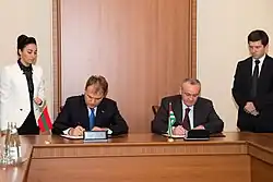 Abkhazian President Alexander Ankvab with Transnistrian President Yevgeny Shevchuk in 2013. Both Abkhazia and Transnistria have been described as puppet states of Russia.
