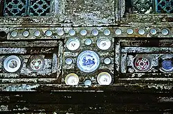 The uppermost inner sanctum (jero) is the most sacred courtyard of the Balinese temple. The courtyard features an 11-tiered meru tower, the most sacred shrine of the Pura Kehen dedicated to the God that protects the temple. A padmasana lotus shrine is also located in this courtyard, dedicated to the highest Hindu Trimurti of Brahma, Shiva and Vishnu. Several other shrines surround the main meru tower, dedicated to the gods of the local geography, for example, the mountain gods. Porcelain plates decorate the wall below the inner sanctum. Some of these depict a scene of rural England, with a watermill and a coach drawn by four horses.[5]