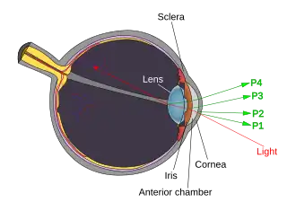 Purkinje images are reflections of objects from the structure of the eye. They are also known as Purkinje reflexes and as Purkinje–Sanson images. At least four Purkinje images are usually visible in the normal eye. The first Purkinje image (P1) is the reflection from the outer surface of the cornea. The second Purkinje image (P2) is the reflection from the inner surface of the cornea. The third Purkinje image (P3) is the reflection from the outer (anterior) surface of the lens. The fourth Purkinje image (P4) is the reflection from the inner (posterior) surface of the lens. Unlike the others, P4 is an inverted image.