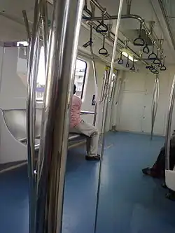 BMRC procured 150 metro coaches for fifty 3-car train sets for Phase l of Namma Metro from BEML-Hyundai Rotem at a cost of ₹1,672.50 crore (₹16.72 billion).[56] Coaches were 20.8 metres (68 ft) long, 2.88 metres (9.4 ft) wide and 3.8 metres (12 ft) high. Each coach has a seating capacity of about 50 and standing capacity of approximately 306, making each train have a capacity of about 1000.[57] Traction was through four 180 kW motors in each motor coach. The trains have a maximum speed of 80 km/h, axle load of 15 tonnes, and operate on 750 volt direct current with third rail power collection. The coaches are made of stainless steel and are fully air-conditioned, and contain longitudinal banks of seats, wide vestibules between coaches, non-skid and non-slip floor surfaces, four wide passenger access doors on each side, an automatic voice announcement system and electronic information and destination displays.