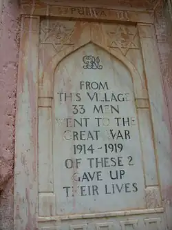 There is a white marble plaque in the village which commemorates the contribution of 33 unnamed men from the village, who went to the Great War (1914–1919) and fought on the side of the British imperial forces.
