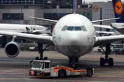 In aviation, pushback is an airport procedure during which an aircraft is pushed backwards away from its parking position, usually at an airport gate by external power.[1][2] Pushbacks are carried out by special, low-profile vehicles called pushback tractors or tugs.