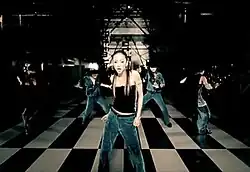 A music video to "Put ‘Em Up" was directed by Ugichin, and was filmed at a construction site.[9][1] Throughout the music video, Amuro dances with three male and three female dancers, with additional shots of her singing the track without participating in any dance sections; Amuro stated that she wanted to strongly incorporate her skills as a singer and a dancer in this video.[1] The song and video were included in Best Fiction, with the video appearing on her video album Filmography 2001-2005 (2005).[10][11] Additionally, the video won two categories at the 2004 MTV Video Music Awards Japan: Best R&B Video, and the Japan category for the Best Buzz Asia award.[12] Since its release, "Put 'Em Up" has appeared on four of Amuro's concert tours and subsequent live releases: So Crazy Best Singles, Space of Hip-Pop, Live Style 2006, and Best Fiction.[b]