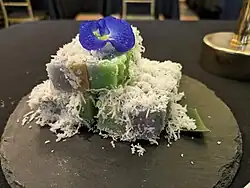 Putugal, also known as kuih putugal or kuih Portugal, is a Eurasian steamed rice cake or kuih that appears in all the former Portuguese territories of Asia.[1] Putugal is typically made from rice or tapioca flour traditionally colored blue using the butterfly pea flower, stuffed with ripened banana and garnished with grated coconut.[2] Among Eurasians, the dessert is a staple during festive celebrations such as Christmas.[3]