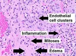 A pyogenic granuloma or lobular capillary hemangioma[3] is a vascular tumor that occurs on both mucosa and skin, and appears as an overgrowth of tissue due to irritation, physical trauma, or hormonal factors.[4][5] It is often found to involve the gums, skin, or nasal septum, and has also been found far from the head, such as in the thigh.[6]
