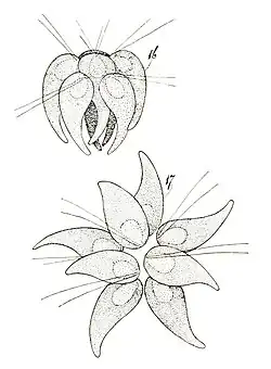 Pyrobotrys consists of colonies (termed coenobia) of four, eight or 16 arranged in two or four tiers, with a star- or mulberry-like shape. Cells are spherical, ovoid, ellipsoid, or pear-shaped. Each has two equal flagella, two contractile vacuoles at the base of the flagella, and a large cup-shaped chloroplast with or without a stigma with no pyrenoids.[2]