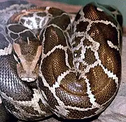 The Pythonidae, commonly known as pythons, are a family of nonvenomous snakes found in Africa, Asia, and Australia. Among its members are some of the largest snakes in the world. Ten genera and 39 species are currently recognized. Being naturally non-venomous, pythons must constrict their prey to induce cardiac arrest prior to consumption. Pythons will typically strike at and bite their prey of choice to gain hold of it; they then must use physical strength to constrict their prey, by coiling their muscular bodies around the animal, effectively suffocating it before swallowing whole. This is in stark contrast to venomous snakes such as the rattlesnake, for example, which delivers a swift, venomous bite but releases, waiting as the prey succumbs to envenomation before being consumed. Collectively, the pythons are well-documented and studied as constrictors, much like other non-venomous snakes, including the boas and even kingsnakes of the New World.[2]