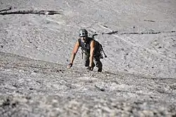 The west face of the formation is popular with rock climbers and has several multi-pitch slab climbs easily visible from the Tioga Road.[6] Earliest was Dike Route a 6 pitch YDS 5.9R first climbed in August 1966 by Tom Gerughty, Roger Evje and Dave Meeks.[7] Other popular climbs include Zee Tree (a 5 pitch YDS 5.7)[8] and Aqua Knobby (a 4 pitch YDS 5.9)[9]