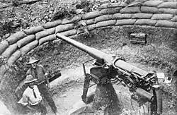 At the end of World War I, 36 guns were still in service in the home air defense of Britain, 10 on the Western Front and 2 in Mesopotamia where it was typically mounted on river barges.[6] The gun remained in Royal Navy anti-aircraft use, in the form of the new Mk V version, on smaller ships in World War II because of its low and high angle firing.
